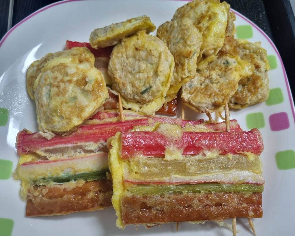 써니랑 저는 동그랑땡과 꼬치전만 먹고 싶은데, 모둠전에는 동태 전까지 있어서 사장님께 부탁해서 두 가지만 사고 싶다고 했더니 이렇게 반반씩 포장해 주셨어요.👍