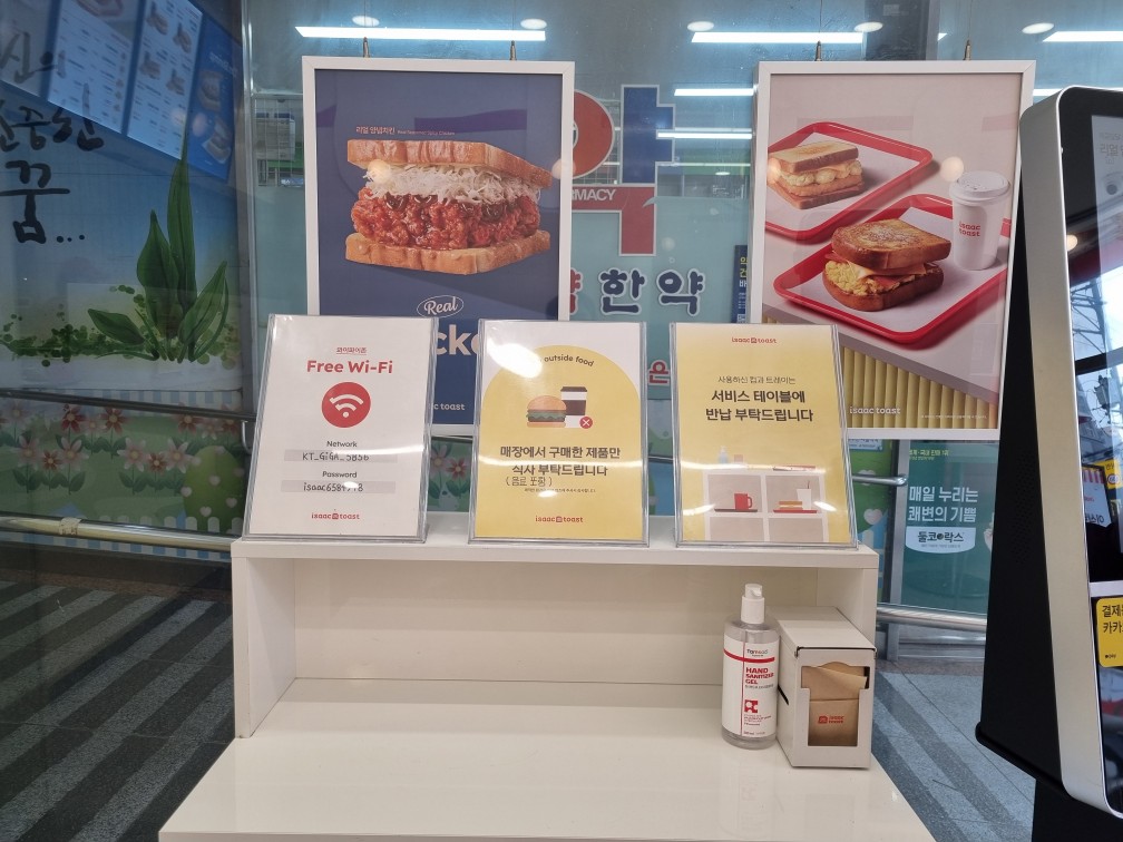키오스크 옆에는 서비스 테이블이 있는데, 손 소독제랑 티슈가 준비되어 있었어요.